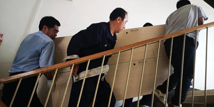 當(dāng)日天氣十分潮濕悶熱,不動(dòng)都是一身汗,但是黨員同志們在周玉斌的帶領(lǐng)下,一件一件搬動(dòng)近兩米的衣柜,一步一步搬運(yùn)至宿舍樓四樓。經(jīng)過大家的共同努力,終于將幾組衣柜搬運(yùn)到了新員工宿舍,并細(xì)致地更換了柜鎖。