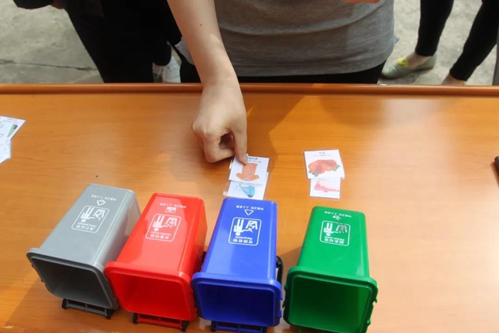 隨機抽取10張寫有各種垃圾物的卡片,在30秒內完成判斷、分類,并準確投入對應的微型垃圾桶內……