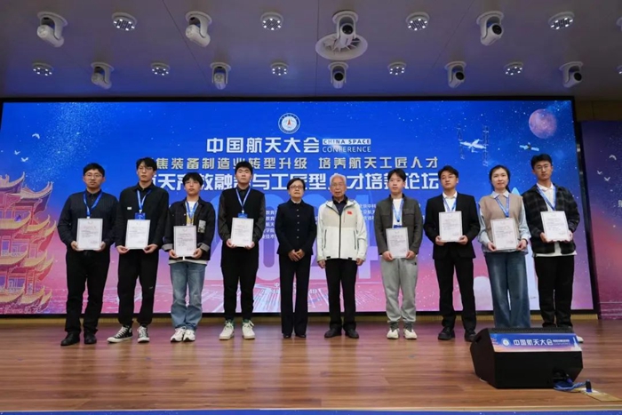 “五一”勞動節前夕,在武漢召開的中國航天大會“全國職業院校科普衛星研制工程邀請賽”頒獎儀式上,中國職業技術教育學會會長、教育部原副部長魯昕為技師學院獲獎選手代表邱世龍頒獎,并與中國運載火箭技術研究院龍樂豪院士一同和獲獎選手合影留念。