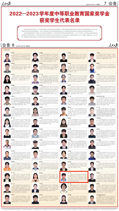 5月4日、5日,《人民日報》專版刊登了100名研究生國家獎學金獲獎學生優秀代表、100名本專科生國家獎學金獲獎學生優秀代表、100名中等職業教育國家獎學金獲獎學生優秀代表名錄。北京市工業技師學院環保與生物制藥系2021級環境保護與檢測專業學生王珂,榜上有名。