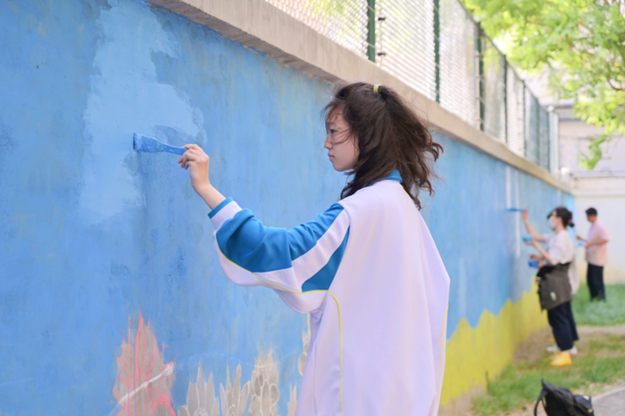 祈東家園社區與技師學院北校區僅一墻之隔。為推進學院與社區和諧共建,技師學院師生利用自己的長處積極服務社區居民。自今年4月份以來,技師學院文創系師生們選擇了雙方共享的一面墻體,以“幸福祈東 共建共享美麗家園”為主題,每周三下午都要來到祈東家園社區,為社區居民繪制社區院墻。師生們巧妙地將象征著生機與活力的向日葵、風車以及社區家園圖案等元素融入墻繪作品。經過7次精心繪制,色彩鮮艷、生動活潑的墻繪作品逐步呈現,為社區帶來了新氣象,讓幸福祁東更加美麗,也讓圍墻變成了社區精神文明建設、黨建宣傳的新窗口。