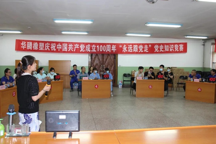 6月22日,華騰橡塑公司黨委舉辦“永遠跟黨走”黨史知識競賽?;顒又荚谝再惔賹W,以學促干,激勵廣大黨員干部滿懷信心邁進建設行業(yè)領先的科技創(chuàng)新型企業(yè)新征程。此次競賽共有8個黨支部組隊參加。各黨支部書記、支部委員、入黨積極分子、共青團員、群眾代表參加活動,并參與觀眾答題環(huán)節(jié)。