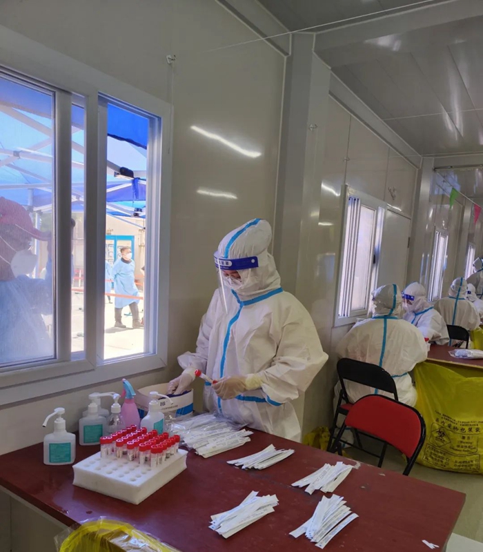 隨著天氣愈發的燥熱,換上大白的我們,衣服瞬間就已經濕透了,但大家沒有一句怨言,繼續戰斗在檢測一線。有的時候做核酸的居民太多,我們的醫護人員和志愿者不能按時吃飯,好在小區的群眾都很配合,一句句“謝謝,辛苦了”沁入心脾,真的很感動。