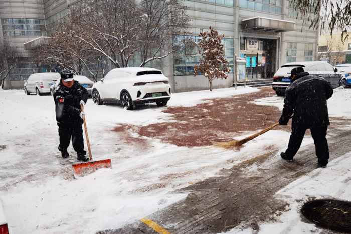 大雪壓城,華騰拓展公司迅速響應,每天派出50余名職工進行掃雪鏟冰行動。為了確保在寫字樓中辦公的客戶出行和業(yè)務不受影響,華騰拓展職工冒雪開展掃雪鏟冰工作,并對主要路段使用融雪劑進行融雪作業(yè),防止結冰打滑產生安全事故。