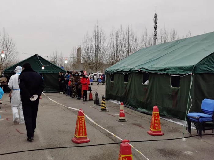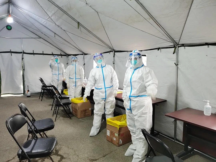 采樣期間,因人員較多,采樣工作都在室外進行。工作在最低溫度達到零下10度左右的環(huán)境里,42名應急隊員穿戴全副武裝的防護服,不僅要直面寒冷天氣的侵襲,還要克服醫(yī)用防護服、醫(yī)用防護眼鏡、防護口罩等一層層防護用品所帶來的不便。