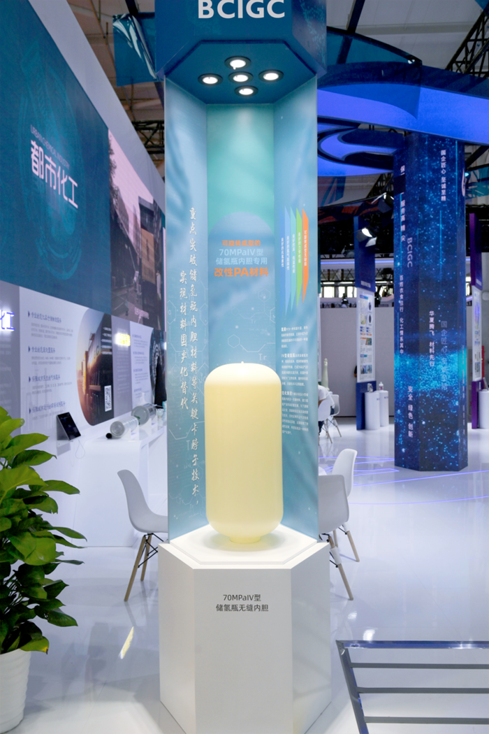 剛剛邁入北京化工集團展位所在的4號展廳,在大門左側(cè),近1米高的儲氫瓶內(nèi)膽吸引了觀展人群的目光,由集團所屬華騰京研公司正在研制的,重點突破儲氫瓶內(nèi)膽關(guān)鍵材料等 “卡脖子”技術(shù)的內(nèi)膽實物,將人們引進北京化工集團的展位。
