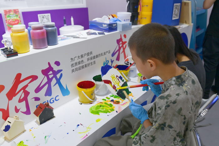 在“涂我、粘我”展區(qū),大朋友、小朋友們紛紛拿起小扇子、小木制房子,用不同的涂料在上面作畫、上顏料;在干箱手套互動區(qū),觀展者興致勃勃地套上干箱手套,模擬化學(xué)試驗操作,將試劑滴入不同化學(xué)液體中,觀察其中的變化;在防靜電手套互動區(qū),觀眾們紛紛體驗不戴手套的“麻酥”感和戴上手套后的安全感。3個互動區(qū)使觀展者在動手參與中了解產(chǎn)品的特性,對化學(xué)讓生活更美好有了切身的感受。